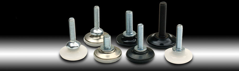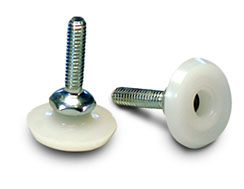 Standard base diameters include 1-1/8" and 1-11/16", with the bases constructed from HDPE or nylon in either a natural white or black color; with a variety of threaded stems, with thread sizes including 1/4-20, 5/16-18, and 3/8-16, and thread lengths ranging from 1/2" up to 2-1/2" (hex). All threads are constructed from heavy duty steel with a zinc or black oxide finish.